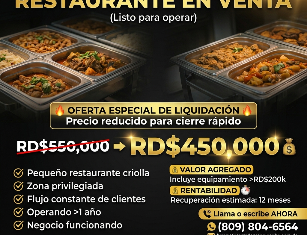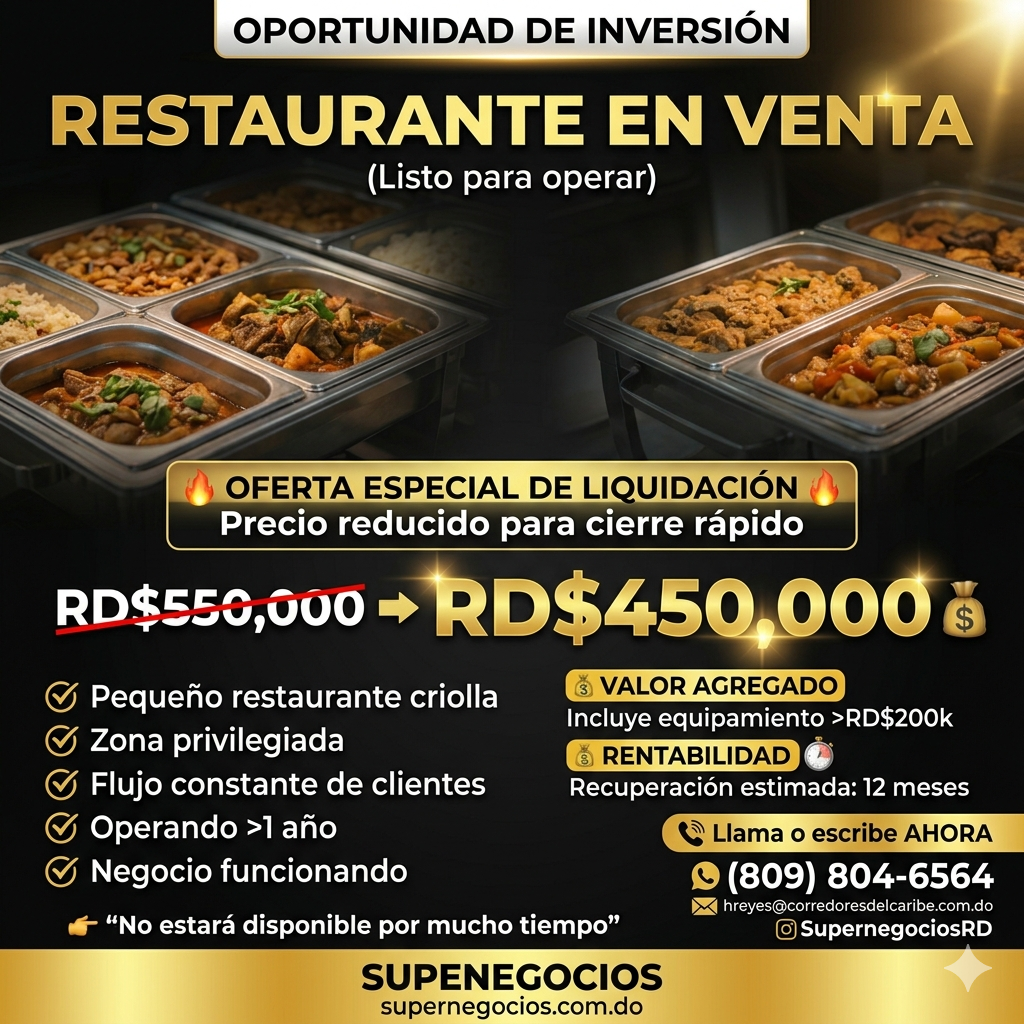 El negocio está en funcionamiento actualmente. El valor del mobiliario y equipos es de más de RD$200,000, lo que representa más del 40%. Ventas mensuales: RD$250,000. Gastos muy bajos. Alquiler: RD$30,000